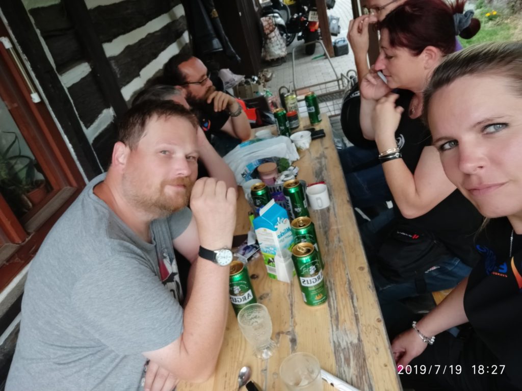 Odvážilci se našli tito: Viking a jeho Haryk (HD 1200), Dragon na Daddlym (HD 1200), Čára s nesmrtelným Varanem, Kudrnáč se svým GS (BMW 1200), Luci na kávičce R6, Maky na Beky s osobní blondýnou (Kytí, BMW 1200 R) a moje maličkost s Arankou (BMW 1200 RT).