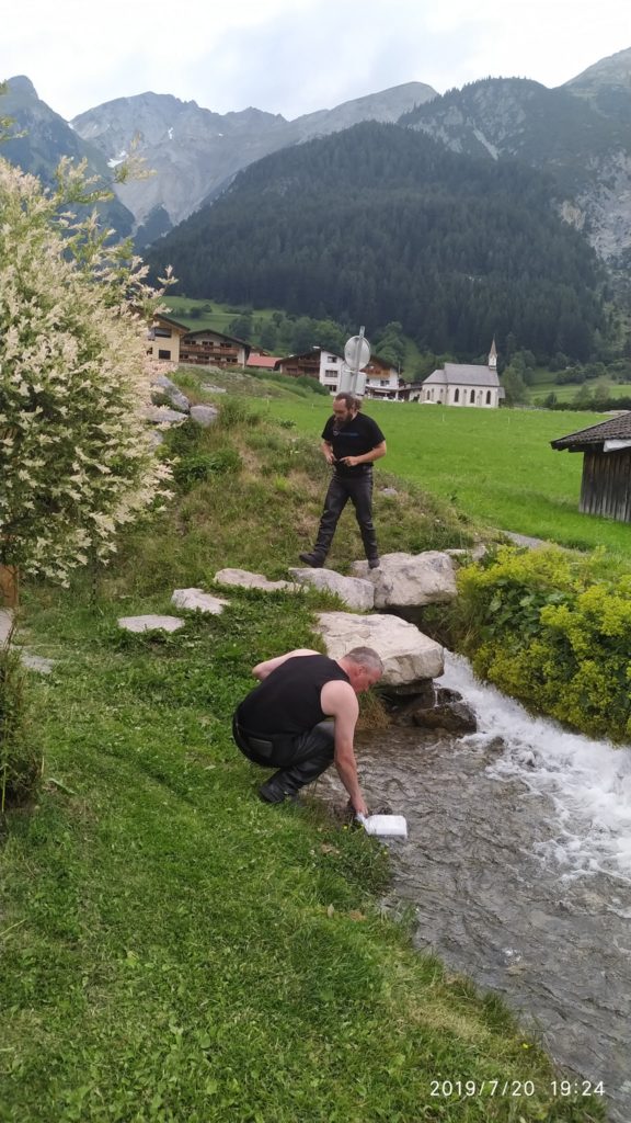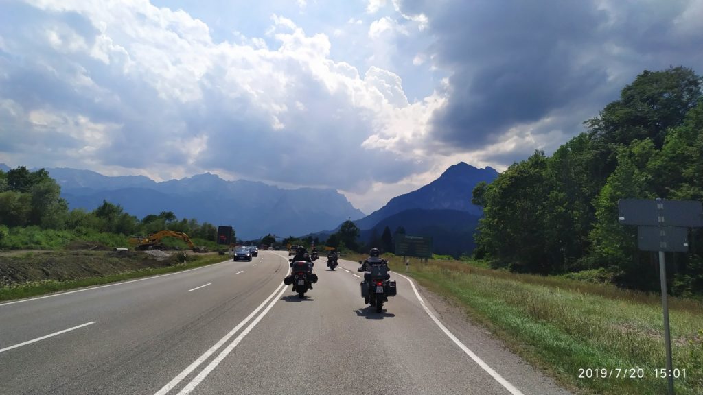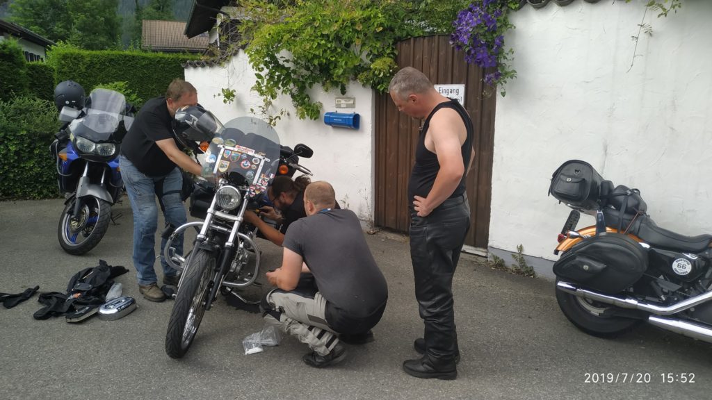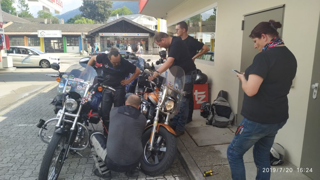 Kdybych z podobných výletů mohl škrtnout první a poslední etapu, nemělo by to žádnou chybu. Bohužel krásy hor jsou daleko a tak první etapa měří 477km a má nás zavést do Landecku. Cesta je to nuda, drtivá většina po dálnici a na cestě leží Mnichov a Ga-Pa, což obojí projet stojí silné nervy. A Vikingova Haryka zrcátko, prostě se uklepalo k smrti. Za Ga-Pa na posledních osmdesáti kilometrech se konečně něco objevuje. Jenže se taky objevuje, že Haryci mají dneska den a ten Dragonův uchcává benzín. Šikovný Dragon s Kudrnáčem vytahují vercajk a hadičky a za pár minut je opraveno. Ovšem! Kluci to udělali moc dlouhý a hadička se skřípla, což způsobilo, že Haryk nestartoval a ještě si vytloukl baterku. Takže kabely, které si koupil Viking, znovu oprava, ale povedlo se. Na místě vznikla památná fotografie s názvem: proč si já blbec koupil Haryka. Unavení projíždíme Fernpass a padáme do Landecku. Oblíbený Rifflercamp nás ovšem vítá s plnou obsazeností (zatím se tam místo dycky našlo). Tak popojíždíme 16 km na západ a bivakujeme v campu Alrberg, malý, super zázemí. Při večerním sezení konečně předává Luci zásnubní prsten Maky a chystá se svatba, prý pod Mont Blancem, kdo by se tam nechtěl vzít.