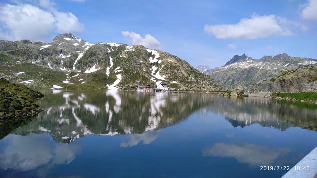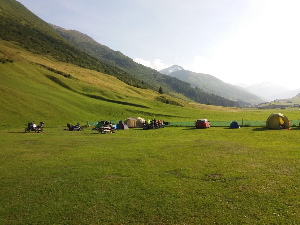 Ráno se poprvé stalo, že hodinky ukazovaly 9:00 a všechny motorky stály nabalené a nastartované před kempem. Vyrážíme s touhou chladu hor směr Rosazza. Chybkou v navigaci se ovšem ocitáme na Bochetto Sessera, což taky není špatný, ale rosazzský kamenný most asi už neuvidíme. Míjíme plánované ubytování u Lago di Orta a Stradou Luigi Cadorna se blížíme k Lago Maggiore, které je opravdu maggiore. Tahle stráda je malebná pašerácká stezka, místy široká tak akorát na motorku s báglama a odměnou panu itineráři je nádherný Vikingův úsměv a nadávky ostatních. Pak už spadneme k jezeru a po jeho břehu se přes Locarno dostáváme zpět do půvabného Švýcarska, kde se napojujeme na silnici (částečně dálnici) číslo 13 a pak nacházíme ubytování v kempu u Splügen. Bombastický kemp, jednoduchý, suprově vybavený. A těšíme se na zítra.