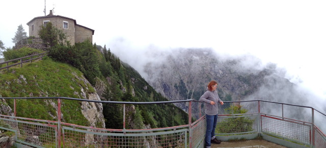 Noc nám rozhodování neulehčila. V noci lilo jako z konve a ráno jsme měli leccos mokré. A drobné mrholení nebylo nejlepší ani pro jedno. Vidět hladinu jezera bez výhledu nás nakonec nelákalo tolik, jako risk a vidět Orlí hnízdo. Co když se třeba dostaneme nad mraky a budeme se moci projít?! A tak se jelo. Nejdříve za mrholení na parkoviště pod Orlím hnízdem, po té autobusem na horní parkoviště k tunelu, tunelem, výtahem a najednou jsme byli tam. Dalo by se říci , že v obýváku fuhrera. Mimochodem k jeho působení tam bylo mnoho brožur v různých jazycích. Snaha o vyrovnání s vlastní nijak vlídnou historií byla velmi, velmi patrná. Vlastně se nedá mluvit o snaze. Prostě jsou s touto epizodou ve své historii již vyrovnaní.