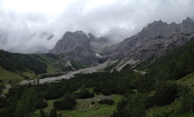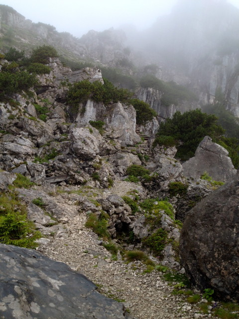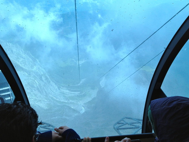 Cestou z chaty občas na nás juklo údolí, od lanovky už taky bylo občas na chvilku vidět dolů. No sráz neuvěřitelnej! Až se mi dělalo šoufl. Prvních 5 minut v lanovce bylo utrpení.