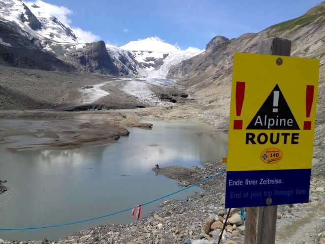 Na Edelweissspitze byla sice malá, ale přesto mlha. Jeli jsme proto rovnou před Hochtor na vyhlídku Franze Josefa s tím, že se na EWS vrátíme odpoledne. Tam bylo úplné azúro. A tak jsme sundali moto oblečení, nandali pohorky a šlo se k ledovci. Zdá se vám od vyhlídky kousek? Na to zapomeňte. Je to pěknej flák cesty. A v poslední chvíli docela nahraně. Všude kolem vás cedulky, že dál jdete na vlastní riziko, atp., a před vámi rozpadající se ledovec. Zdá se, že jdete po šutrech. Slezete je a zjistíte, že vrstva kamení je na vrstvě ledu. A že zrovna tam, kde jsem před chvilkou šel, měl led stěží půl metru tloušťku. Jít kousek mimo cestičku znamenalo se s tenčícím ledem urvat a žuchnout do slušný jeskyňky. Hladký, bůh ví jak hluboko vedoucí. No, a to jsme byli opatrní. Někteří šílenci neváhali stoupat na samotnou hranu ledu. Finální pohled stál za to. Jste u ledovce, který je starý tisíce let. Jako křišťál. A není to obyčejný led. Je tvrdý, tvrdší než z ledničky. Možná tíha a tlak? Nevím. Cucal jsem ho hodně dlouho.