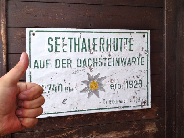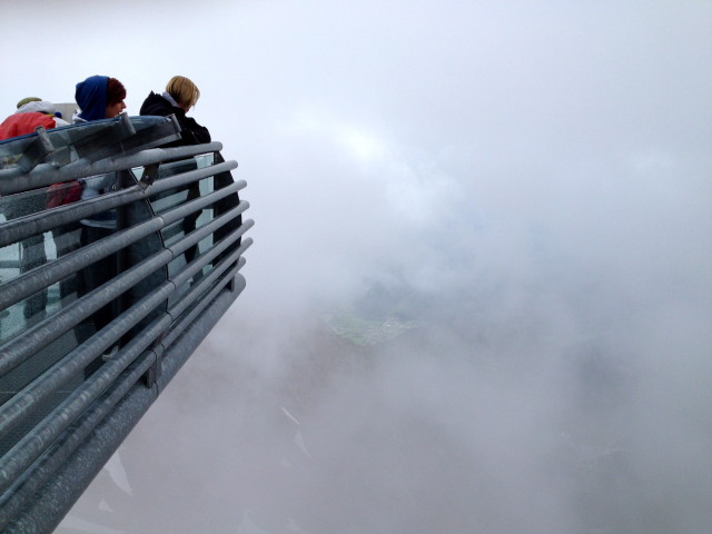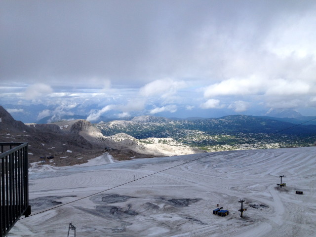 Cestu zpět jsme dali malinko delší a s 20 minutovou vydejchávací pauzou jsme nastoupili do lanovky. Přátelé, tahle lanovka vede na strmý sráz Dachsteinu bez jediného mezisloupu. Poslední úsek lanovka stoupá téměř přímo vzhůru. A tenhle den navíc do mraku, do nicoty. A tak to vypadalo i nahoře. Vyhlídka se skleněným oknem v podlaze je tak i nazvaná – „Vyhlídka do nicoty.“ Tak abychom nekoukali jenom na nic, šli jsme se opět projít po Dachsteinwarten k chatě ve více než 2700 m.n.m. Občas mrholilo, byla mlha, šlo se sněhem, ale čím blíže jsme chalupě byli, tím méně nás tu cestu ještě šlo. Přesto byla chata narvaná k prasknutí. Dali jsme řeč s místním alpinistou. Sympaťák. A představte si, že zatímco my jeli lanovkou, on po tom srázu lezl 4 hodiny! Na rukách jenom cyklistické rukavice, no sám nadšen z počasí nebyl, nicméně dal to, co bylo absolutně nad moje možnosti, přestože měl o mnohem více křížků než já.