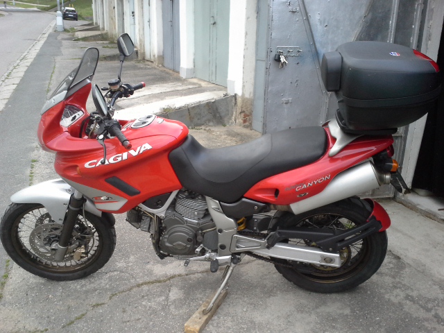Tedy seznamte se Cagiva Gran Canyon 900ie 45000km, 50kW (můj brácha z doby, kdy jsme vlastnili továrnu s velkým D – Ducati SS900 má 63 a Monster) rok 98 a výrobní číslo 170. Trochu se červenám tou správnou barvou a bohužel taky proto, že se mi nevěří a všichni mě pomlouvají, ale já to svému BuFovi vyvrátím :-)
