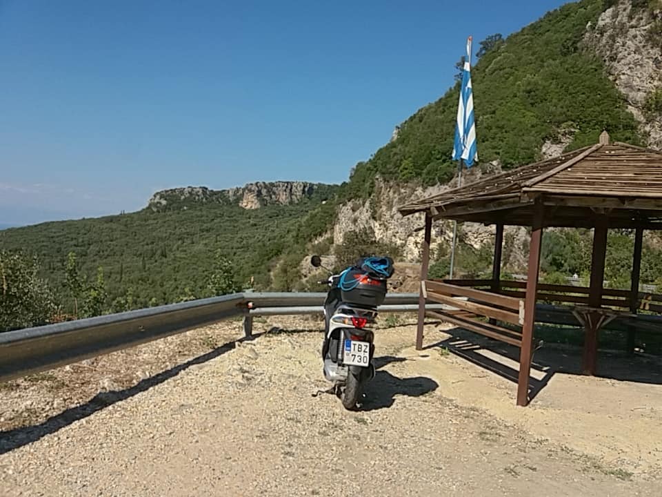 Bohužel čas už pokročil a tak se pomalu vypravuji směrem zpátky na hlavní město a pak dolů do vesnic Benitses a Moraitika (kde trávíme dovolenou).Cestou se potkám pouze s jednou uzavírkou na silnici, kterou jsem chtěla jet. A tak holt znovu zamířím na Skipero, kudy už jsem dneska jednou jela. Silnice je nicméně pěkná, zatáčkovitá a tak mi to vůbec neva. Překvapuje mě, že i na skůtru se dají zatáčky fakt užít. Přes Korfu mířím dolů a tentokrát ani nevím jak, trefuji se na odbočku, kterou jsem ráno hledala a nenašla. Achilleon. Vila, kterou si tu nechala vystavět císařovna Sisi. Prohlížím si ho jen ze sedla motorky, protože tu moc není kde zastavit. Sjedu serpentýnama dolů k vodě a podél vody už projíždím přes přístav v Benitses zpátky do Moraitiky.
