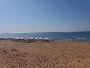 Prvním bodem na mapě, který jsem měla v plánu navštívit byla písečná pláž Issos. K odbočce dorážím poměrně rychle. Sjíždím z hlavní na úzkou silničku. Míjím krásné řecké domky, obklopené olivovníky, fíkovníky a opunciemi. Po několika stech metrech se přede mnou cesta rozdvojuje. Vida, že rovně je to na nuda pláž vydávám se raději doprava a končím po pár metrech u altánku s mapou. Dál už je jen hromada písku ve které by nešlo jet ani na kole. Vzpomínám na Maďarsko :-)